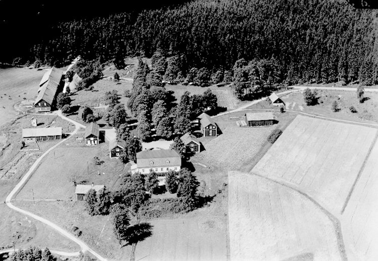Flygfoto över Lidetorp, bostadshus och ekonomibyggnader.