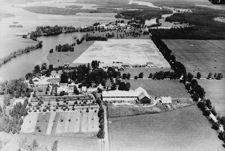 Flygfoto över Sund, bostadshus och ekonomibyggnader.