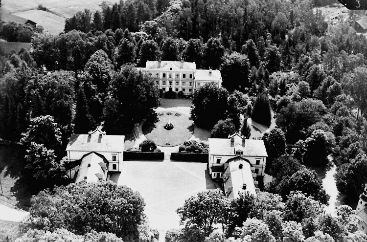 Flygfoto över Dylta Bruk, herrgårdsbyggnad och flygelbyggnader.