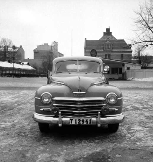 Taxin står på Trädgårdsgatan. Till höger Stortorget och macken som låg i hörnet Trädgårdsgatan/Stortorget där senare gamla polishuset byggdes. I fonden till höger syns norra delen av Nikolaiskolan.