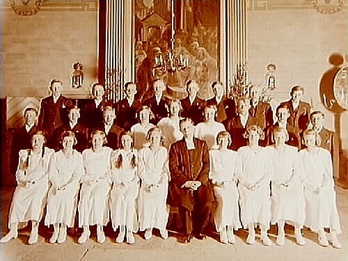 Konfirmander, 12 flickor, 14 pojkar och prästen.