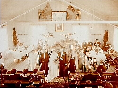 Frikyrkobröllop, brudpar och bröllopsgäster.
