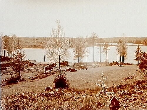 Kilsbergen, Ramsjön, sjöutsikt vid skolan, tre bilar vid landsvägen, kor.