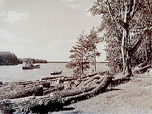 Parti från Lindön vid Hjälmaren, lastskuta och en roddbåt med fyra pojkar.