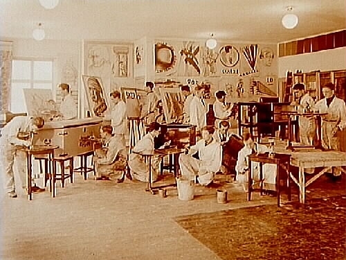 Örebro Yrkesskola, interiör av målarskolan, 14 pojkar som målar och dekorerar.
