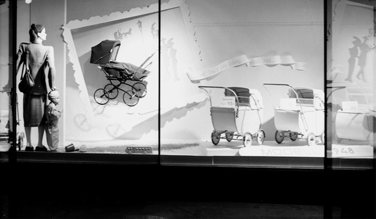 Konsum, skyltfönster, barnvagnar.