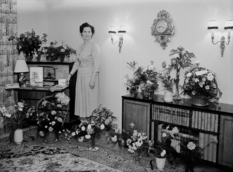 Titel: Rumsinteriör, en kvinna. Fru Wilhelmsson på 50 årsdagen.
