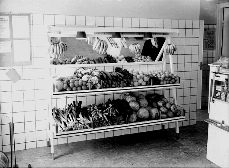 Zanders Köttaffär, affärsinteriör, fruktdisk.