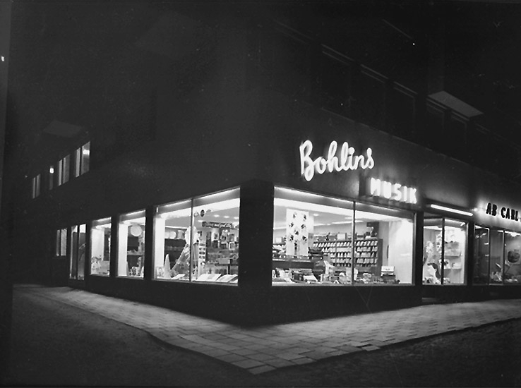 Titel: Bohlins Musik, affärsbyggnad, skyltfönster.