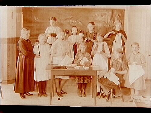 Latorpsbruk skola, klassrumsinteriör, 10 skolbarn med lärare.