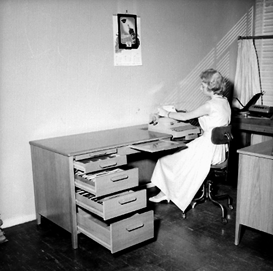 Kontorsinteriör, en kvinna vid skrivmaskinen.