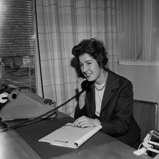 Titel: Kontorsinteriör, en kvinna pratar i telefon. Wigrell & Co.
