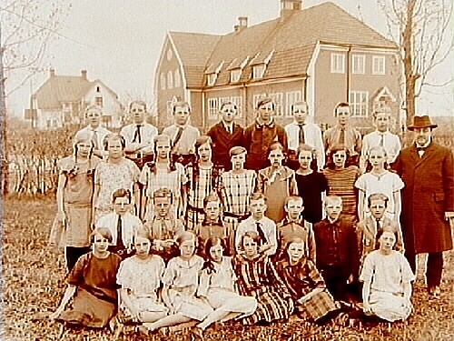 Almby Folkskolan, en och en halvvånings skolbyggnad i bakgrunden.