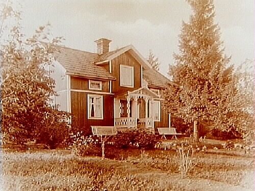 En och en halvvånings bostadshus med frontespis och veranda i snickarglädje.