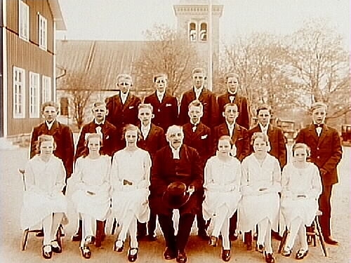 Konfirmander, 6 flickor, 11 pojkar och pastor Sjöström.