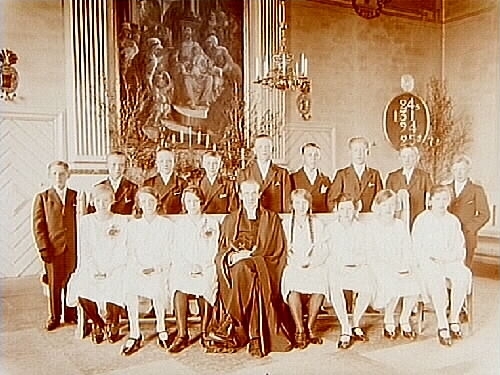 Konfirmander, 7 flickor, 9 pojkar och pastor Franzén.