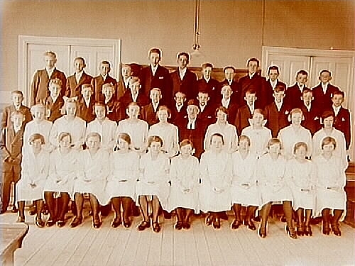 Konfirmander, 20 flickor, 26 pojkar och prästen.