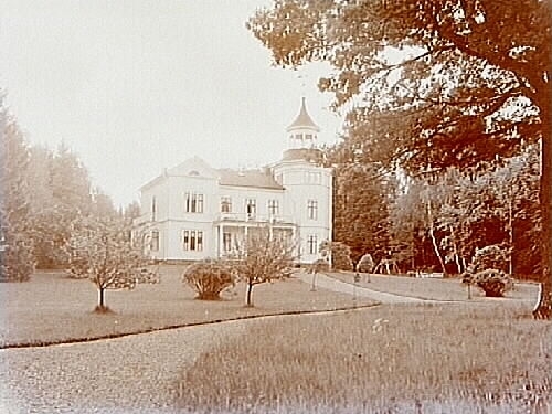 Tvåvånings villa med ett torn, burspråk, balkonger och verandor.