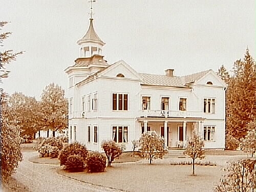 Tvåvånings villa med ett torn, burspråk, balkonger och verandor.