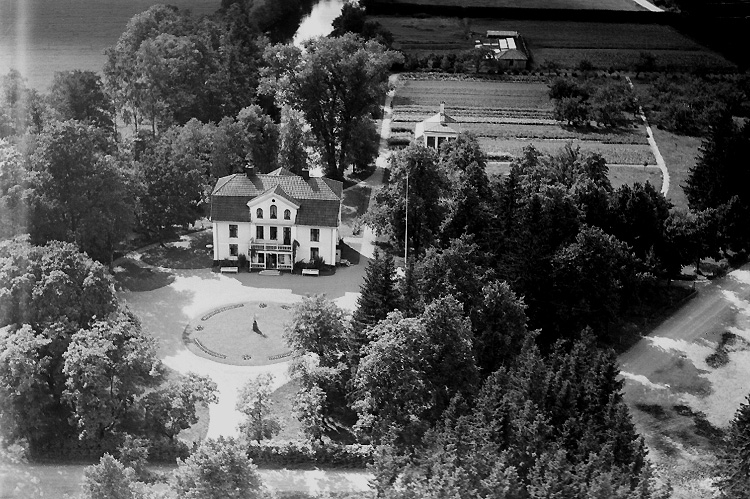 Flygfoto över Källtorps Herrgård, tvåvånings herrgårdsbyggnad.