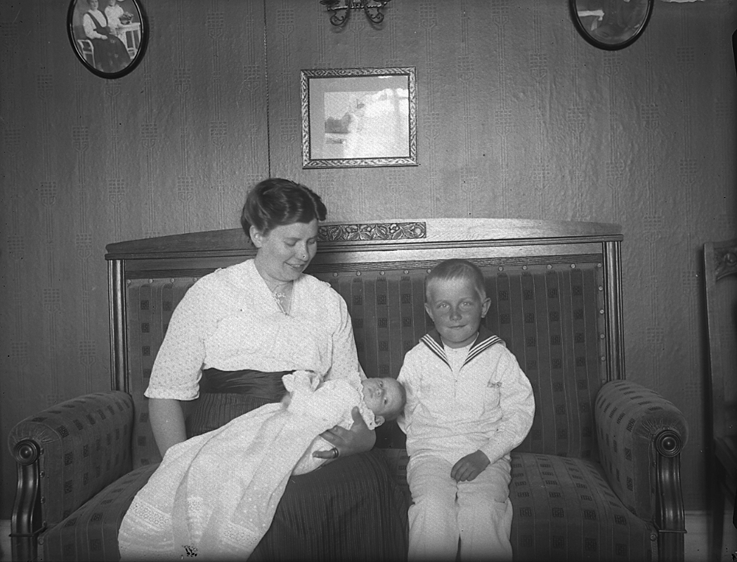 En kvinna med ett spädbarn i knät sitter med en större pojke i en s.k. "inventionssoffa". Lars (givaren) känner inte igen henne eller pojken med säkerhet, men när Maria Wistrand nämner att det i lådan med glasplåtar fanns en lapp med namnet "Börje Ramqvist" säger han att bilden skulle kunna föreställa hans faster hans faster Elin som var gift med byggmästare Gösta Ramqvist. Hon var samtidigt sjuksköterska och föreståndarinna för ålderdomshemmet i Västerås. I sånt fall är den större pojken hennes son Börje Ramqvist och spädbarnet hennes son Gösta Wilhelm. Lars (givaren) kollar i sin släktbok och berättar att Börje var född 1912 och Gösta Wilhelm 1915. Den lille dog dock redan 1917 alltså skulle bilden vara tagen någon gång mellan dessa årtal, troligen närmare 1915 eftersom barnet bär dopdräkt.