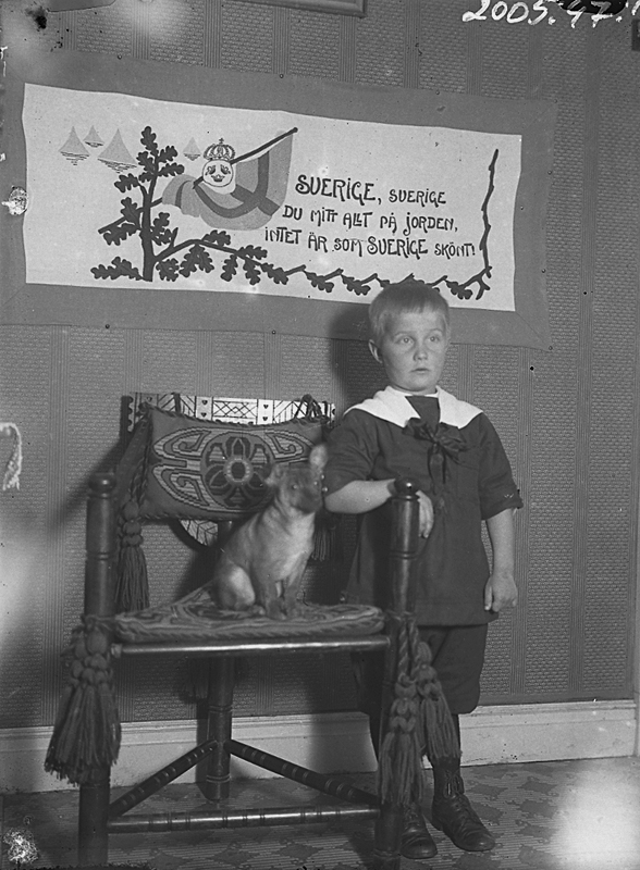 En pojke vid en stol under en bonad. Lars (givaren) tror att bilden föreställer Börje Ramqvist (givarens kusin, son till faster Elin), men är inte absolut säker. Stolen skall Lars bror Per ha fått senare. Troligen tagen ca 1915-1920. Lars berättar att de träffades i ungdomen då och då. "Han blev ingenjör och jobbade hos Luth och Rosén som var ett el-bolag på den tiden. Sedan åkte han till Polen och träffade en flicka som han gifte sig med, men det blev inte bra. Dom skilde sig rätt så snart."