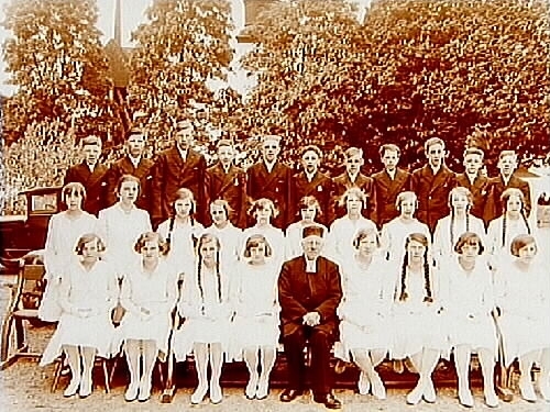 Konfirmander, 18 flickor, 11 pojkar och kyrkoherde Sven Jäderlund.