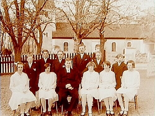 Konfirmander, 5 flickor, 6 pojkar och pastor Bergner.