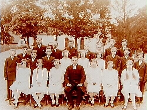 Konfirmander, 9 flickor, 14 pojkar och kyrkoherde Aveborg.