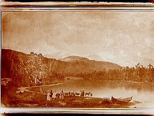 Oljemålning föreställande: Lappar med renar vid en fjällsjö.