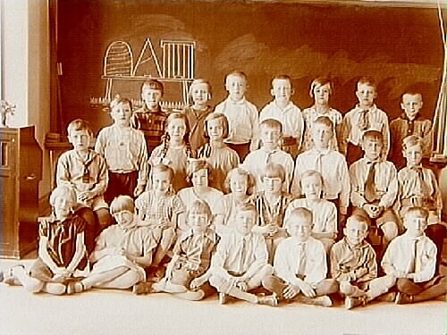 Engelbrektsskolan, klassrumsinteriör, 27 skolbarn med lärarinna fröken Herta Elander.