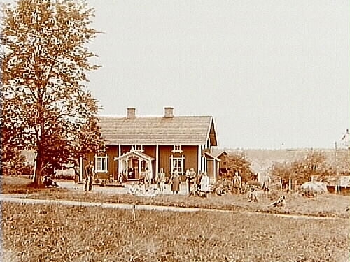 En och en halvvånings bostadshus med veranda och förstuga, 19 personer framför stugan.