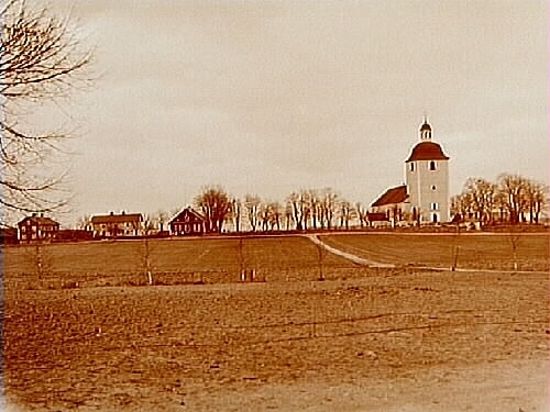 Stora Mellösa kyrka, kyrkobyggnad och tre bostadshus.