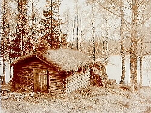 Nubbsmedja vid sjön Björken, knuttimrad smedja med torvtak.