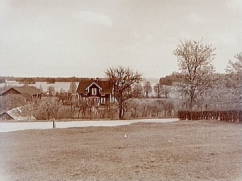 Utsikt från åsen mot sjön Sotter, en och en halv vånings bostadshus med frontespis och förstebro.