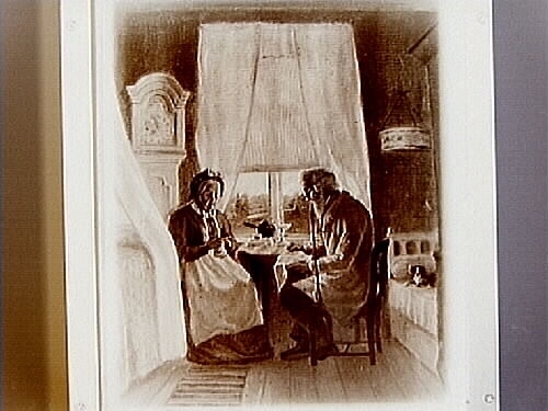 Oljemålning. Motiv: ett äldre par vid kaffebordet.