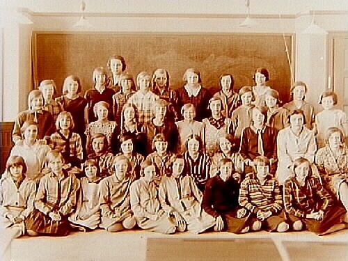 Engelbrektsskolan, klassrumsinteriör, 39 skolflickor med lärarinna fru Herta Nessén, sal 21.