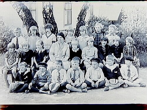 Rynningeskolan, 23 skolbarn med lärarinna fru Andersson på skolgården.