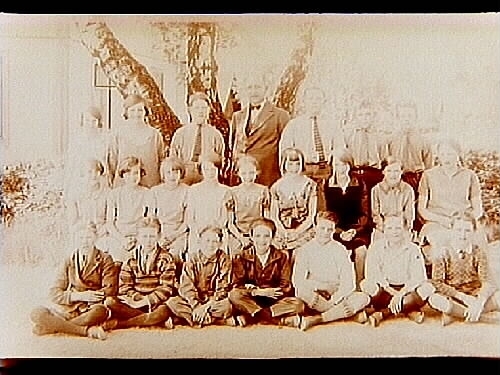 Rynningeskolan, 22 skolbarn med lärare Sam. Nystedt på skolgården.