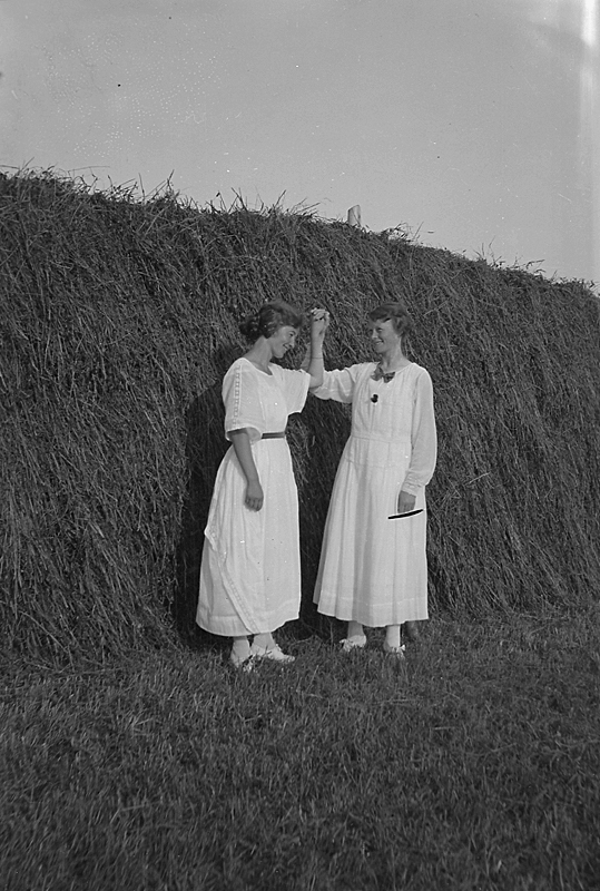 Titel: Två kvinnor vid höstacken. Höbärgning hos Ljungström i Dalarna.