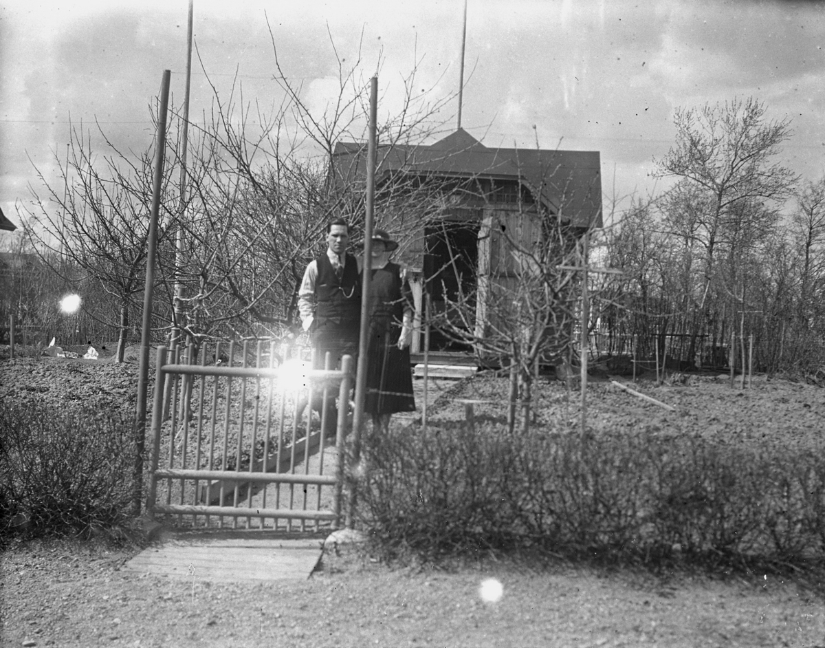 Stuga, ett par framför stugan. Karl Hedström.