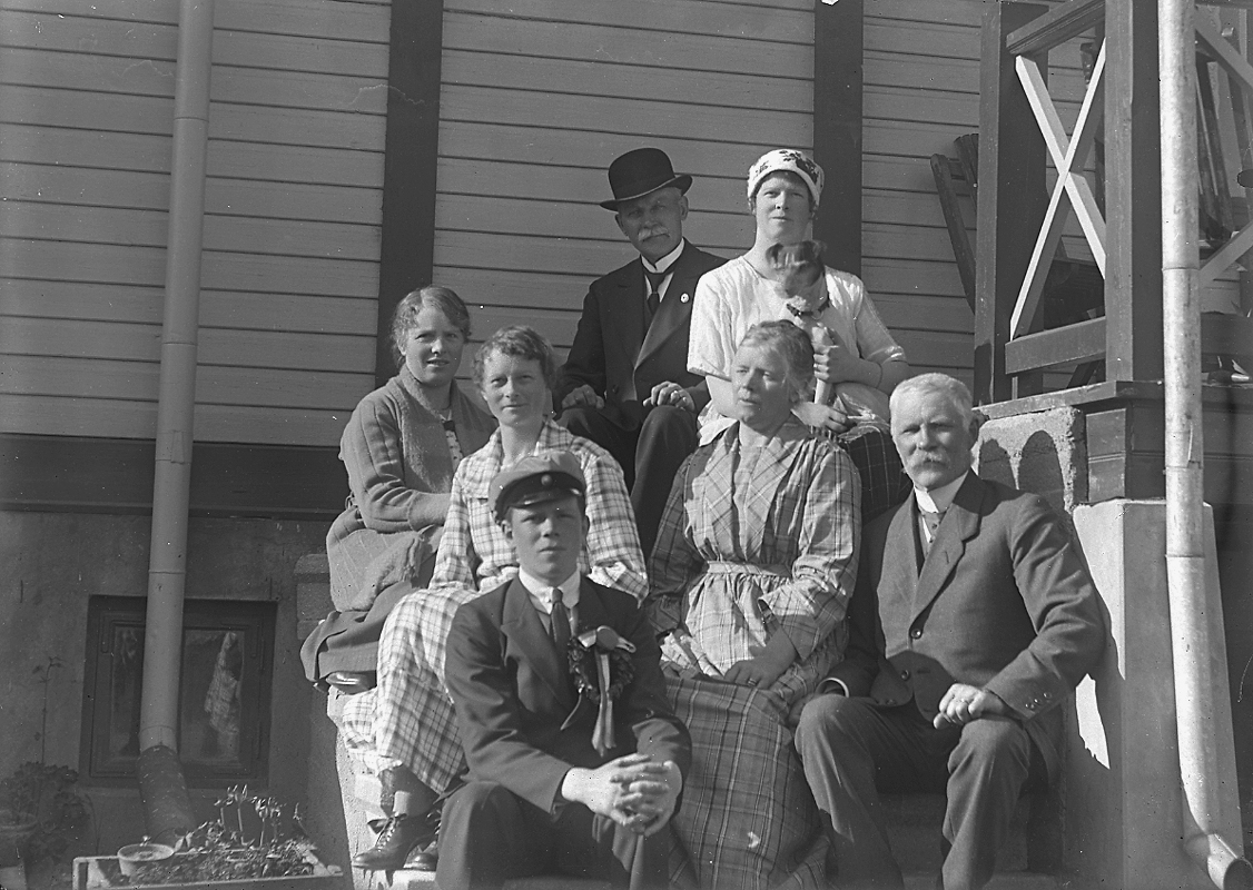 Bostadshus, familjen Lindbergs villa. Familjen Lindberg, sju personer och en hund.
