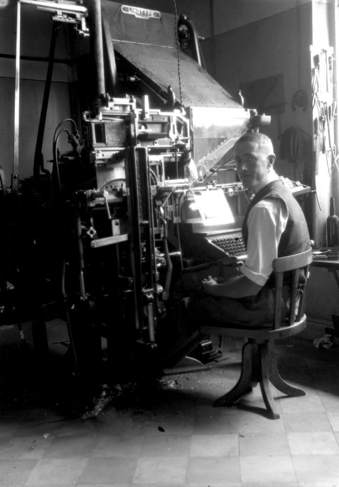 Tryckeriföreningen Solid, interiör från tryckeriet, en tryckeriarbetare.