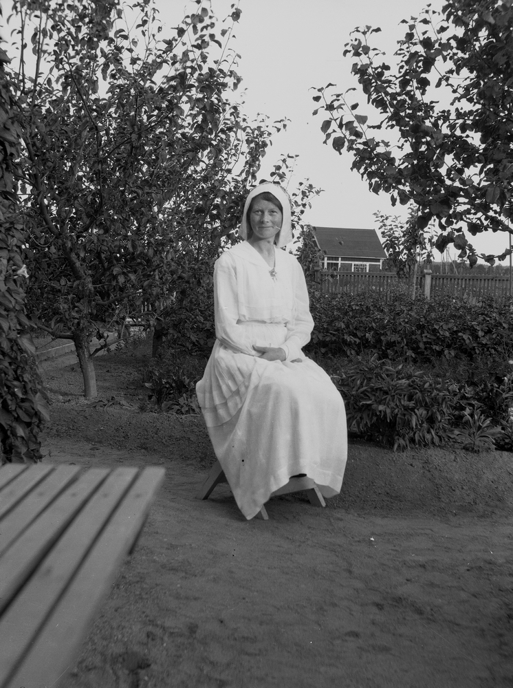 En kvinna. Stuga i bakgrunden.