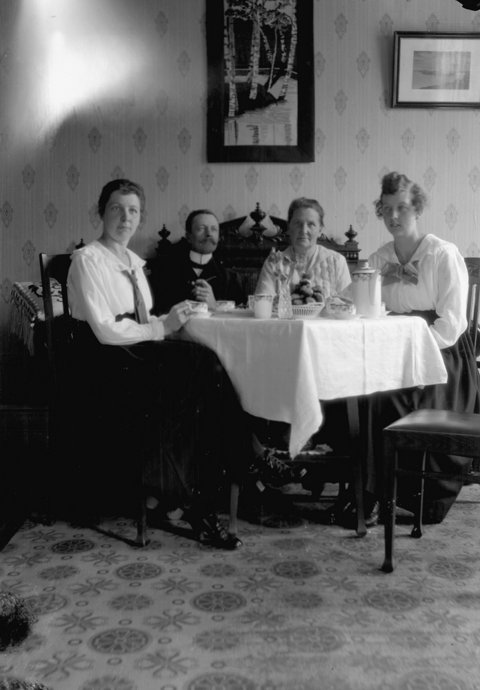 Rumsinteriör, fyra personer vid bordet.