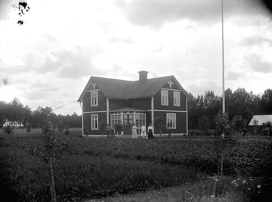 Titel: Bostadshus, familjegrupp fyra personer framför huset.