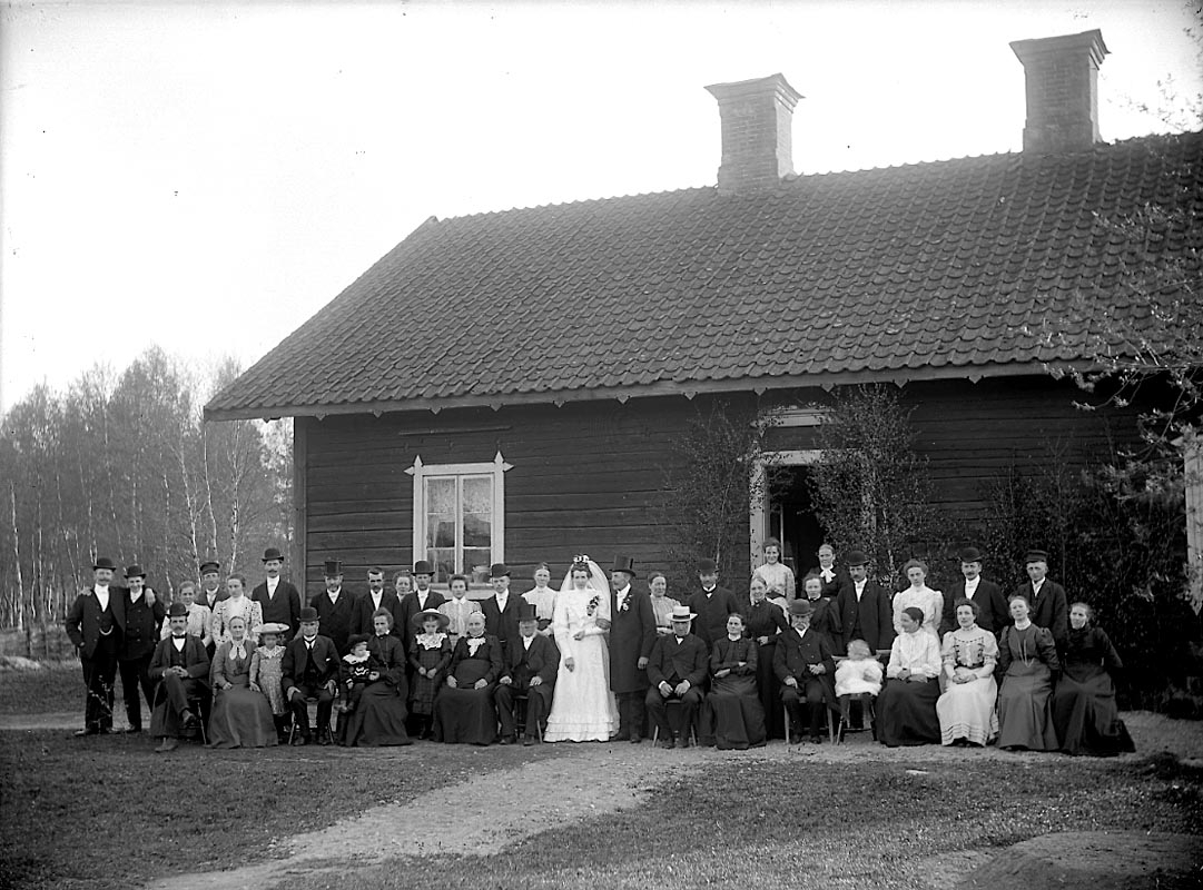 Titel: Bröllop, brudpar och bröllopsgäster. Bostadshus.