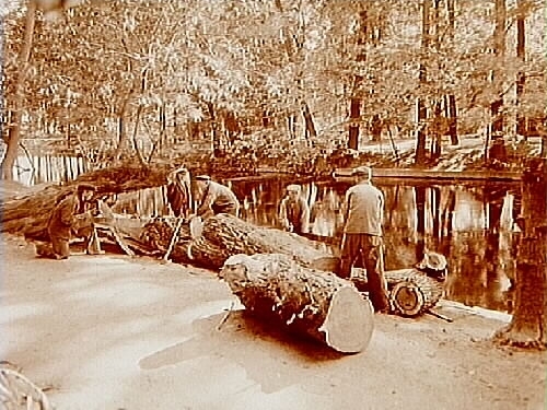 Fem män sågar itu stammen.
