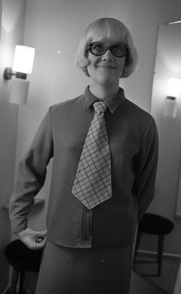 En kvinna visar en slips från Sten Pantzars herrekiperingsaffär. Den är ljusrutig och hon bär den till en ljus långärmad blus och ljus kjol. Hon bär ett par runda glasögon.