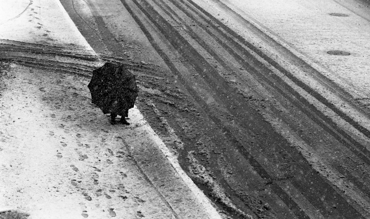 En man sitter på huk med ett paraply uppspänt över sig på trottoaren i centrala Örebro. Det ligger snö på marken.